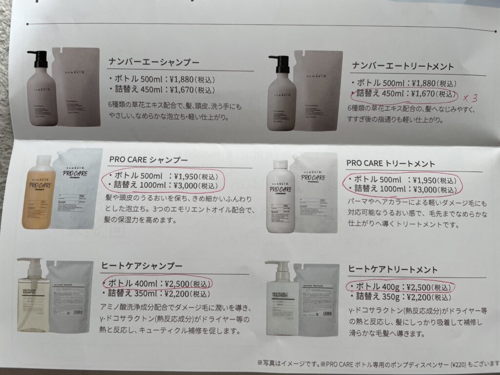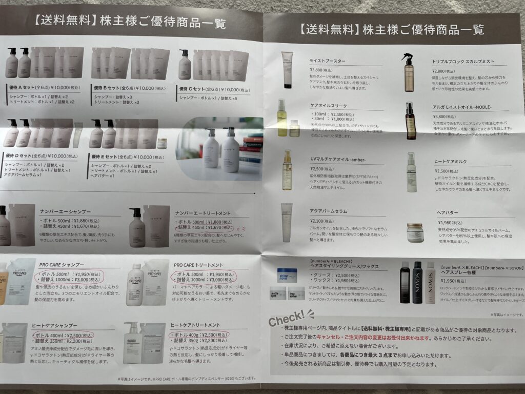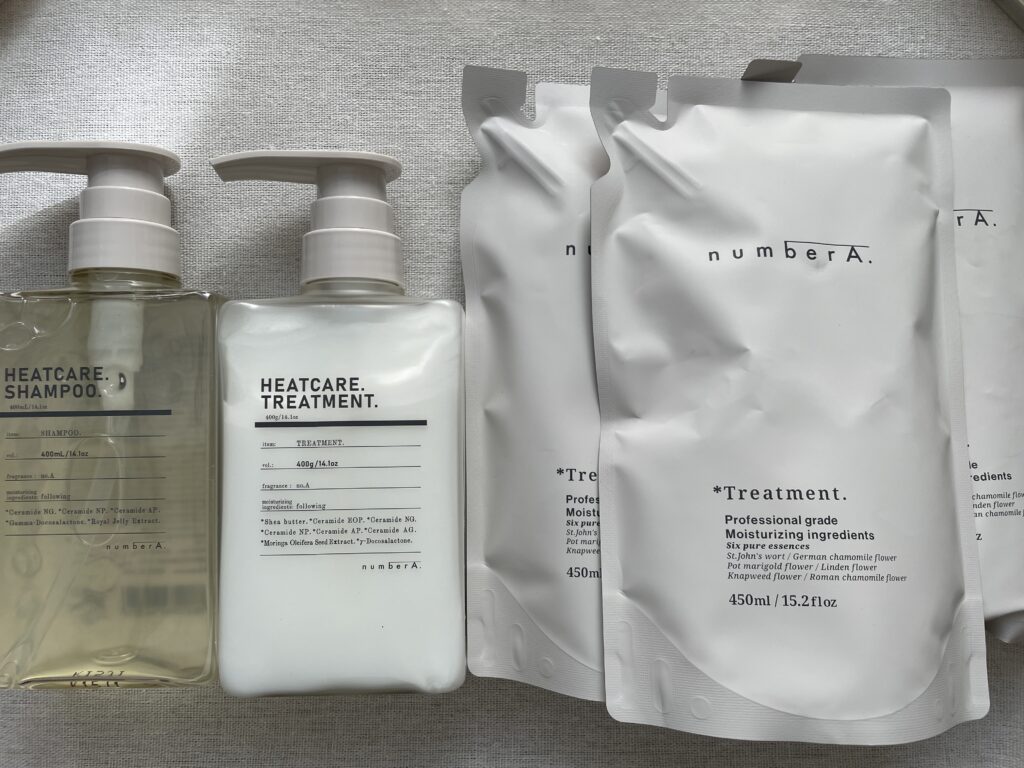 前回の優待にはなかった新発売のヒートケアシャンプー・トリートメントのセット、前回の優待でいただいて現在使用中のnumberA.シャンプーとトリートメントの詰め替えです。